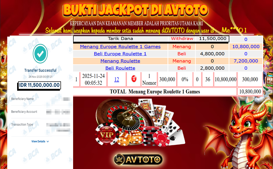 SELAMAT KEPADA USER ID : ME***01 TELAH JACKPOT DI ROULLETE GAMES AVTOTO 11,5 JUTA!!!